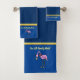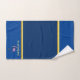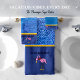 Personalize romantic modern gold foil stripes with blue texture and image of a Pink Flamingos standing with a red bow tie