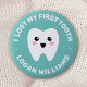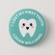 Badge pour enfants avec une dent heureuse sur un arrière - plan bleu turquoise et le texte "J'ai perdu ma première dent" et nom personnalisable ci-dessous.