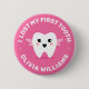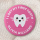Insigne avec une petite fée sur un arrière - plan rose chaud et le texte "J'ai perdu ma première dent" et nom personnalisable ci-dessous.