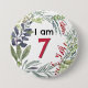 Un joli badge épingle avec des mots "I am 7" entouré d'un cercle de feuilles d'hiver et de baies dans un style aquarelle. Le bouton mignon est blanc avec un rouge foncé numéro sept. Un bel accessoire pour un anniversaire.