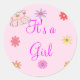 Utilisez cet autocollant rose "C'est une fille" pour sceller vos annonces de naissance ou vos invitations baby showers. Sticker / étiquette dispose d'un arrière - plan rose avec des éclaboussures de fleurs et les mots "It's A Girl".