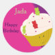 Sticker avec un cupcake à l'ours gummy souriant. Ce design a un arrière - plan rose et violet. Cet article montre les mots Joyeux anniversaire et un nom personnalisable.