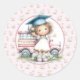 A bright and joyful illustration featuring a young graduate in front of a pink school bus, framed by white daisies on a pale pink backdrop. The artwork blends innocence, celebration, and soft pastel charm.