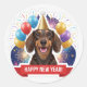 Cute Dachshund dog with a small party hat, surrounded by colorful balloons and sparkling confetti. Bright, realistic, and festive Happy New Year sticker