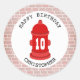 Un autocollant de fête d'anniversaire avec une illustration d'une borne d'incendie rouge et d'une bordure en brique. Personnalisez le texte. Recherchez les invitations de fête d'anniversaire de pompier correspondantes chez Jill's Paperie.