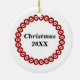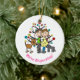 Un couple d'attente en bâton, deux chats gris et un chien marron devant l'arbre de vacances décoré avec un espace qui dit "Nous nous attendons !" en rose. Le dos ornemental a une bague de coeur rouge avec le texte que vous pouvez customiser avec l'année actuelle Noël!