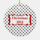 Un couple d'attente, un super héros en bas âge, et un chat devant l'arbre de vacances décoré avec une zone qui dit "Nous nous attendons !". L'ornement en arrière est blanc avec des pois noirs, une bannière blanche à bords rouges, et un texte rouge qui lit Noël 2014.