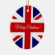 Ornement britannique personnalisé d'arbre de Noël de drapeau d'Union Jack. Joyeuses décorations faites sur commande de vacances de Noël dans en rond ou forme de coeur. Drapeau BRITANNIQUE de conception du Royaume-Uni gigaoctet Grande-Bretagne. Le décor anglais patriotique de Noël de fierté pour des amis, famille, enfants, travailleur de Co, employé, patron, enfants, épousant des couples, l'épouse nouvellement, maman et papa, grands-parents, parents, le bébé etc. ajoutent la salutation et la photo de votre propre saison sur le dos sur option. Modèle élégant de typographie de manuscrit. Ficelle scintillante d'or incluse. Créez votre propre souvenir pour le ęr Noël ensemble ou toute autre occasion.