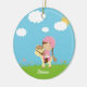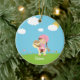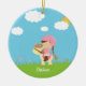 Cet ornement en céramique rond a une fille brune mignonne de cheveux avec des tresses montant sur un cheval de bande dessinée dans un domaine des fleurs. Il y a les nuages gonflés blancs dans le ciel avec le soleil jetant un coup d'oeil par derrière l'un nuage. Ceci peut facilement être customisé avec un nom au fond. Graphiques par des conceptions de Zenware chez Mygrafico
