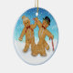 Un trio amusant présente un ornement rond avec une fille en pain d'épices, un garçon et un chien en pain d'épices en laisse. L'arrière - plan est une scène hivernale avec du sol recouvert de neige et des flocons de neige. Autre version disponible avec texte et date de retour personnalisables.