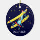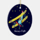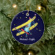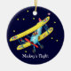 Ornement en céramique avec l'illustration d'un biplan de bande dessinée. Le pilote d'enfant effectue un vol ainsi que le chien et le chat. Mettez votre propre texte sur l'ornement et choisissez votre propre couleur d'arrière - plan ! Grand ornement à accrocher dans la pièce d'un enfant.