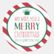Ce joli autocollant de Noël de The Spotted Olive™ présente des rayures rouges et blanches audacieuses, un graphique d'un cadeau et les mots "Nous vous souhaitons un joyeux Noël et une bonne année" mis en caractères amusants. Adorable ! Copyright © 2014 The Spotted Olive™. Tous droits réservés.