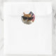 Célébrez le Memorial Day avec cet autocollant cool de ma collection "Kitty Koolness", avec un chat orange et blanc aux teintes noires avec un drapeau américain derrière elle. Photo du designer.