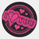 Ce mignon "I Love you" texte et coeurs autocollant en caoutchouc de couleur rose chaud contre un arrière - plan noir est parfait pour embellir les cadeaux de la Saint Valentin, albums photo et plus pour un appel romantique.