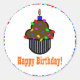 Un autocollant avec une bordure de points rouges, verts, violets et bleus. Illustration du cupcake au chocolat surmonté d'arrosages colorés et d'une bougie bleue. Le texte dit, "Joyeux anniversaire !" mais peut être changé en un autre texte de votre choix. La couleur Arrière - plan peut également être customisée.