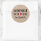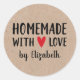 Un autocollant personnalisé "fait maison avec amour" de 3 pouces sur un arrière - plan de couleur kraft. Faites-le le vôtre en ajoutant votre propre nom. Une jolie touche de finition pour tous vos cadeaux faits main. Conçu pour vous par Blackberry Boulevard.