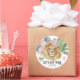 Round birthday sticker featuring a party animal theme with watercolor lion artwork, balloons, and soft jungle greenery accents.