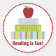 Autocollant rond coloré pour promouvoir la lecture, avec des graphiques d'une pile colorée de livres, avec une pomme rouge sur le dessus. Une bordure pointillée de polka rouge, autour du bord de l'autocollant, et un texte personnalisé rouge qui dit, Lire est Run! Personnalisez pour modifier le texte.