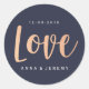 Créez des stickers uniques pour toutes les occasions ! Pour décorer vos courriers, les travaux pratiques de vos enfants et bien plus encore. Ajoutez vos propres designs, textes et photos ! Cet autocollant peut être personnalisé avec votre date et votre nom mariage. La conception comporte une police de script de brosse à feuille d'or rose.