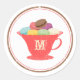 Un autocollant avec une illustration d'inspiration vintage de Macarons français colorés dans une délicate tasse rouge. L'illustration est entourée de cercles décoratifs brun et rouge. Personnalisez avec la lettre de votre initiale.