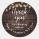 Merci pour fêter avec nous Mariage Sticker, en calligraphie de script rustique, lumières à cordes de soirée cottage, arrière - plan de bois brun foncé.
