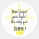 N'oublie pas ta lumière. C'est pour ça que tu SHINE ! Faites passer votre positivité et votre sagesse inspirante avec ce bouton génial. Achetez ce bouton stimulant, gai et positif pour soulever l'esprit des autres pendant que vous le portez. Offrez-le à un ami, un collègue ou un membre de la famille pour qu'il leur sourit.