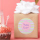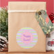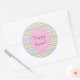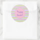 Autocollant rond à l'image de rose pastel violet, lavande, vert, jaune et blanc avec rayures rose entrelacées avec des oeufs de Pâques solides et rayés, et un cercle rose avec une bordure périvent et un sentiment de vacances personnalisable. Voir les confettis assortis, le étiquette et le papier d'emballage. Voir la collection entière de Sticker de Pâques sous la catégorie CARDS & STICKERS dans la section VACANCES.