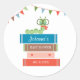 Cet autocollant de faveur moderne et coloré est idéal pour célébrer un Baby shower avec un thème "Apportez un livre pour bébé". Il comporte une pile de livres avec un joli ver de livres sur le dessus portant de grandes lunettes et une cravate d'arc. Un pennant au-dessus ajoute un aspect festif. Cette invitation unisex vous aidera à construire la bibliothèque blanche de bébé qui accueille un événement élégant.