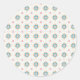 Round sticker with intricate blue and yellow floral pattern on a white background. Below, a sheet shows multiple copies. Elegant and decorative.