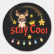 A cute sticker featuring a cheerful cartoon reindeer wearing sunglasses with a confident “stay cool” message. The design includes glowing stars, festive string lights, and a black background, creating a fun and playful holiday vibe. Perfect for decorating gifts, notebooks, planners, or seasonal crafts.