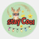 A cute sticker featuring a cheerful cartoon reindeer wearing sunglasses with a confident “stay cool” message. The design includes glowing stars, festive string lights, and a soft green background, creating a fun and playful holiday vibe. Perfect for decorating gifts, notebooks, planners, or seasonal crafts.