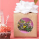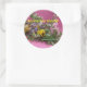 autocollant, grand 3 pouces, rose avec des fleurs de printemps en lettres jaune, bleu, blanc et jaune : "Le printemps est né!"