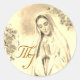 Design présente une belle image de Notre Dame de Fatima comme un ovale au centre. Image de roses délicates roses et blanches formant un cadre. Les initiales des prénoms du couple sont affichées en bas à gauche de l'image. Design également disponible en couleur et en couleur argent. Conçu pour coordonner avec la "Suite Mariage catholique Vierge Marie".