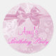 Cet autocollant d'anniversaire personnalisable moderne présente un arc rose sur un arrière - plan rose à fleurs. Customisez-le en ajoutant vos détails dans la police de votre choix !
