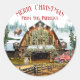 Sticker à feuillage persistant Noël Gîte Rond. Belle grange historique ornée de vitraux centenaires. Décoré pour Noël et Fêtes pour les mariages d'amis, de famille et d'hiver. Le camion vintage arrive avec des arbres et des cadeaux pour la journée spéciale. Buffalo se tient dans la neige au loin. Parfait pour le cadeau de vos amateurs de grange préférés, pour sceller une enveloppe ou sceller un sac à biscuits. Utilisez le message existant ou personnalisez la carte avec votre propre message et le nom de famille ou de l'entreprise. "Joyeux Noël" !