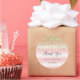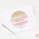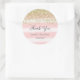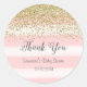 Autocollant rond pour baby shower faveur avec parties scintillant faux or et rayures rose vif arrière - plan.