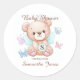 Célébrez la future maman avec un autocollant de baby shower d'ours et de papillons mignons. Le nom de l'événement spécial ainsi que le nom de la mère à être et son monogramme sont en vedette. Idéal pour les cadeaux, les faveurs, et plus encore. Utilisez le modèle pour personnaliser.