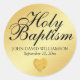 Le Baptême Saint est écrit en gros caractères formels au sommet de cet autocollant or ou sceau d'enveloppe. Le nom du bébé et la date du baptême sont indiqués ci-dessous. La photo d'un coeur de feuille d'or est incluse en bas. Le mariage parfait entre design traditionnel et moderne pour cet événement important. Tout le texte est facilement personnalisé.