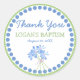 Design d'autocollant de baptême doux. Une double rangée de points bleus et verts borde cet autocollant mignon. Un petit bouquet de fleurs sauvages bleus se trouve en bas. Le texte dit merci, puis le nom et le baptême de l'enfant et la date du baptême. Il est dans le même vert et bleu que les points. Facile à customiser.