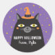 Un mignon chat d'Halloween noir avec un casquette décore cet autocollant. Personnalisez-le pour les gâteries de classe Halloween, ou pour les faveurs de fête Halloween. Conçu pour vous par Blackberry Boulevard.