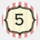 Un autocollant d'anniversaire sur le thème du cirque avec un arrière - plan de rayures rouges et blanches défraîchies. Personnalisez avec votre âge à l'intérieur du cadre de support doré souligné en noir. Invitations assorties disponibles chez Jill's Paperie.