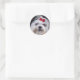 Autocollant rond avec la photo d'un chien maltais, un petit chien de jouet blanc. Elle a un ruban rouge dans sa fourrure.