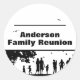 Un graphique de personnes à un pique-nique extérieur est affiché sur des autocollants noirs et blancs. Personnalisez l'autocollant avec votre nom de famille imprimé au-dessus du graphique. Une ligne en haut de l'autocollant peut être utilisée comme un endroit pour le nom d'un membre de la famille à écrire à la main en faisant des étiquettes de nom bon marché pour votre réunion.