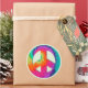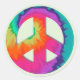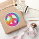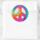 Autocollant rond avec l'image d'un symbole de paix psychédélique aux couleurs vives sur vert clair. Voir collant vinyle taillé sur mesure, confetti, sac de faveur, ballotin, étiquette de faveur, sacs cadeaux, étiquette et papier d'emballage. Voir toute la collection Disco les années 70 Sticker dans les INVITATIONS | Section Stickers & Étiquettes.