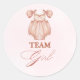 Montrez votre soutien pour la petite manchette avec cet autocollant "Team Girl" ! Conçu avec une aquarelle rose sucrée et une illustration de tenue pour bébé, il est l'accessoire parfait pour les invités à porter. Une façon ludique d'ajouter du plaisir et l'esprit d'équipe à votre genre révéler la fête.