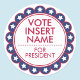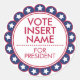 Que vous fassiez campagne pour diriger le pays, votre ville, votre école, votre travail, ou que vous souteniez indépendamment votre candidat favori, ces autocollants vous feront remarquer. Customisez facilement ces autocollants ronds haut de gamme avec votre propre nom, titre ou message. Les plus petits autocollants peuvent être utilisés comme scellés pour vos campagnes de courrier. Ce design présente des couleurs rouges, blanches et bleues avec des étoiles blanches. (Astuce : pour un titre de candidat à deux mots comme "Vice-président", vous pouvez changer le mot "Pour" en "Vice".) Ce sont des autocollants professionnels résistant aux rayures imprimés sur du papier sans acide. Disponible dans une finition brillante ou mate en taille 3 pouces et 1,5 pouce. Quantité minimale de commande faible et pas de frais de configuration.