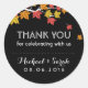 Avoir un mariage à l'automne ? Cet autocollant de remerciement est un complément parfait à votre journée spéciale. Décoré de couleurs automnales vives et colorées, jaune, orange et marron. Design classique et vintage. Feuilles d'érable tombant de l'arbre. Tombe de nouveau amoureux cet automne. Customisez et personnalisez le libellé pour convenir à toute occasion. fête d'anniversaire, anniversaire, douche nuptiale, baby shower, fête de fiançailles ou autre avec thème d'automne.