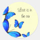 Colorés autocollants d'enveloppe, avec papillons bleu vif, contre un arrière - plan jaune pâle. Super comme cette touche spéciale de finition aux enveloppes de votre invitation de mariage. Customisez avec votre propre texte.
