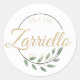 Sticker rond classique - Il a une demi-bague noire autour de l'autocollant avec une feuille de sauce verte en bas et Mr & Mrs en or en haut - Vous pouvez customiser le deuxième nom qui est dans la couleur or - Il a Est. 2022 en bas mais vous pouvez customiser l'année à votre goût. C'est un autocollant très personnalisé, il est parfait et élégant de mettre sur des enveloppes mariages, des tasses, des ordinateurs et bien plus encore!
