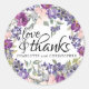 Des prunes et des roses rose vif se joignent à des fleurs sauvages violets pour créer un autocollant de remerciement luxuriant. Love and Thanks est écrit dans une belle police de script. Les noms du couple mariage sont écrits dans une police serif classique.